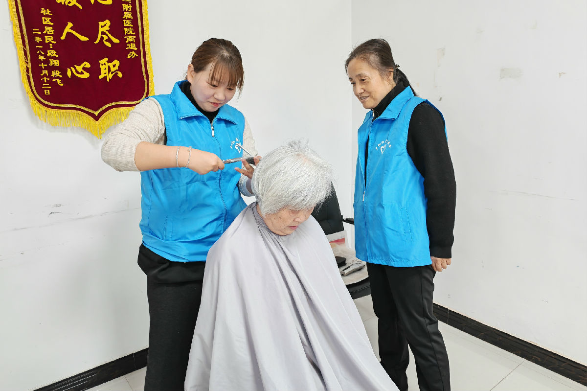 活动现场气氛热烈,志愿服务精准贴心。在活动室内,志愿者们为老同志们免费测量血压、血糖40余人次,并针对个人健康状况给予专业指导,同时发放健康教育宣教册,普及春季多发病防治知识,提升居民健康素养;理发服务尤其受欢迎,志愿者们手法娴熟,为50余位老人解决了“头等大事”,精湛的技艺和热情的服务赢得连连称赞。对于行动不便的高龄老人,还提供上门理发服务,将关怀直接送到家中,让温暖不落一人。同时,志愿者们还向过往群众发放健康教育宣教册,普及春季多发病防治知识,提升居民健康素养。