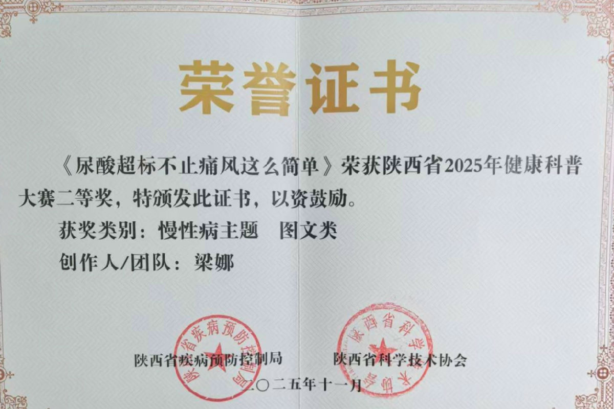 近日,在陕西省科学技术协会、省科技厅及省疾病预防控制局的多项省级评选中,我院选送的科普作品《尿酸超标不止通风这么简单》与《三减三健:和油盐糖“分手大作战”》表现优异,凭借专业的内容、新颖的呈现形式和广泛的科普价值,分别荣获“陕西省2025年健康科普大赛”二等奖,以及“2025年陕西省优秀科普作品征集活动”科普文学类(成年组)三等奖。